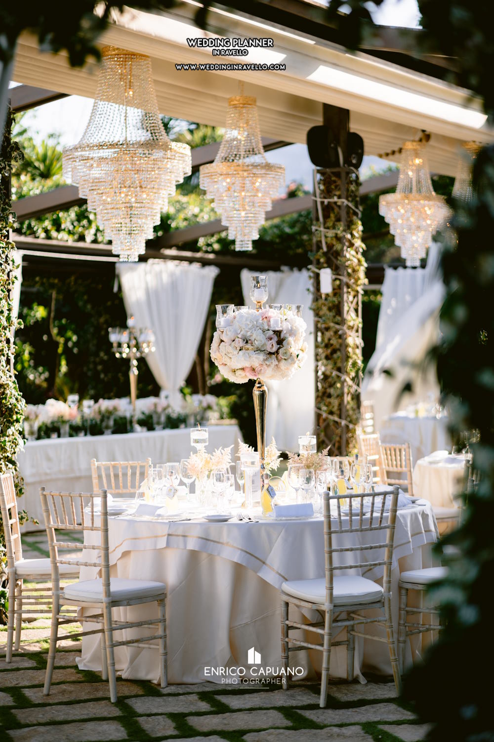 In this captivating photograph, the artistry of wedding planners Mario Capuano and Annamaria Staiano shines through in a truly remarkable display. The scene is set in an open-air dinner area of Villa Eva, exuding elegance and opulence at every turn. The focal point of this spectacular arrangement is the Empire-style chandeliers and lamps that dangle from above, casting a warm and romantic glow over the entire space. The chandeliers, with their intricate details and timeless design, evoke a sense of grandeur and sophistication. They are meticulously placed throughout the area, creating a captivating interplay of light and shadows. Each chandelier seems like a work of art in itself, adding a touch of regal charm to the setting. As the soft evening light bathes the scene, the ambiance becomes magical. The tables are elegantly set, adorned with fine linens, exquisite tableware, and delicate floral arrangements that complement the Empire-style theme. The candlelight from the chandeliers and lamps adds a soft and inviting atmosphere, making this dinner setup a feast for the eyes and the senses. The outdoor setting enhances the experience, allowing guests to dine under the stars while surrounded by the luxury of Empire-style decor. This photograph captures a masterful creation by Mario Capuano and Annamaria Staino, where their expertise in wedding planning transforms an open-air space into a dreamlike tableau of elegance, making it a truly unforgettable event for all who attend.